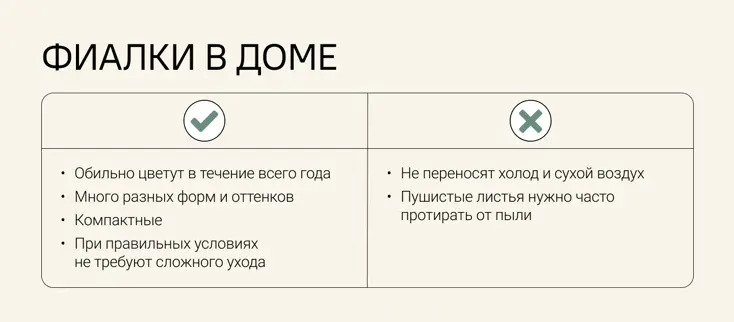 Фиалки любят яркий рассеянный свет. Оптимальная температура для фиалок — 20–24 ℃. И никаких сквозняков! Их нужно поливать по мере подсыхания верхнего слоя почвы, но не пересушивать. Для полива лучше всего подойдёт тёплая, отстоявшаяся вода. Регулярно очищайте листья от пыли.